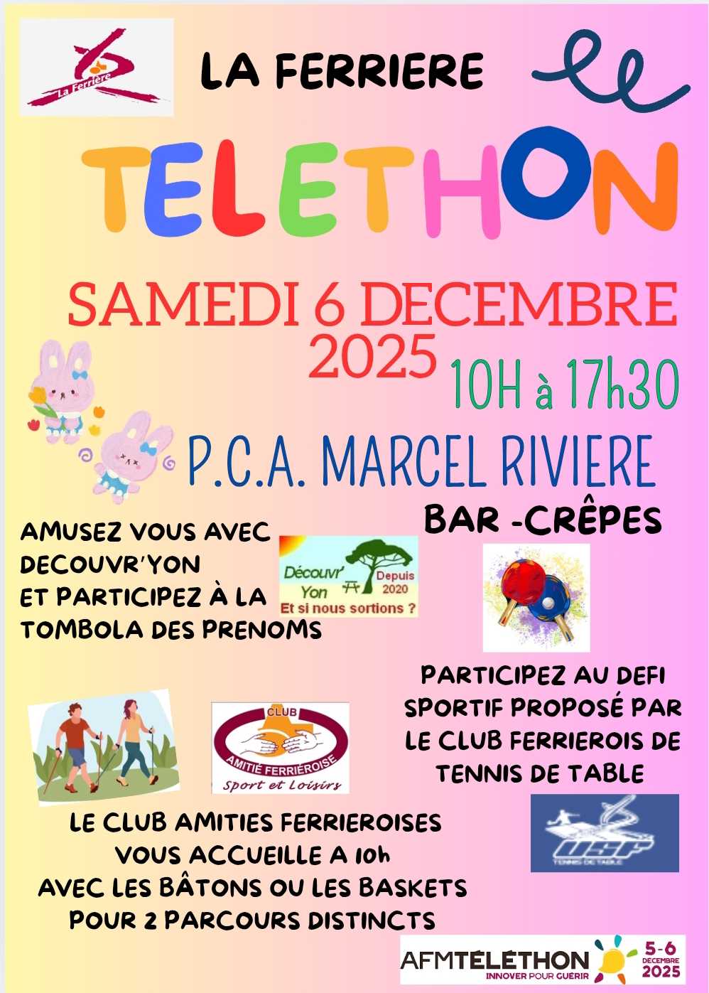 recommandées Le Samedi 06 décembre 2025 de 10h00 à 12h30, et de 14h00 à 17h30 Soutien au Téléthon 2025, à La Ferrière, Pôle Culturel et Associatif Marcel RIVIÈRE - Le matin à la Médiathèque - L'après-midi salle des Nynphéas (rez-de-chaussée) Pensez à covoiturer... Lire plus ... , Transférez/Imprimez ... ; Et si nous sortions !